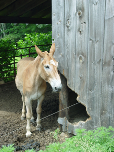 water, mules will often hesitate. They have a natural instinct of self-preservation, and if they were following a group of horses that had crossed a stream, they would stop and wait until the stirred water had cleared to see if passing through was safe. Mules are gifted with extremely keen eyesight. They would never cross over a manhole on the road. They also have a propensity to chew and damage wood and trees. (Note the photo of the mule next to the barn on the right side of this page!)
