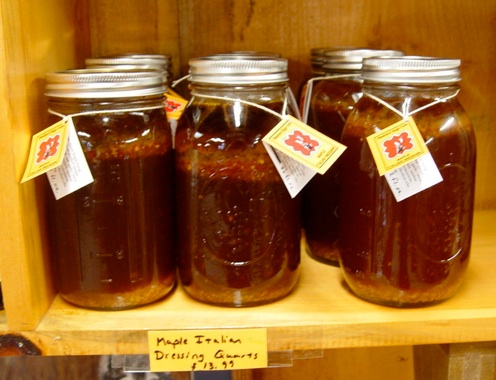 Ingredients: Maine maple syrup, water, soybean oil, distilled vinegar, fructose corn syrup, salt, garlic, onion, dehydrated red bell peppers, xanthan gum, spice, lemon juice concentrate, annatto and caramel, calcium disodium edta.