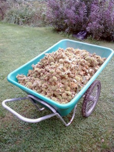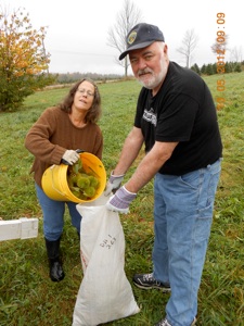 Marharet Raurenhorst and Steven Teed are shown collecting chestnut burs.