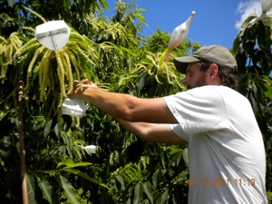 Aaron Grimm is shown hand-pollinating a Maine-native chestnut tree at the Viles Arboretum to produce generation #4 of the breeding program. The American Chestnut tree can not self-pollinate.