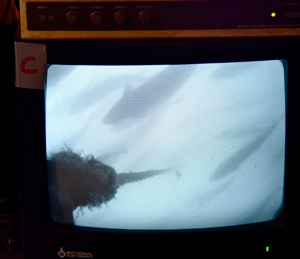 Amidst the fifteen pens situated in the Deep Cove facility is the feeding barge. On the day that Unique Maine Farms visited, there were approximately 450,000 salmon that were swimming in the Deep Cove pens. Brian Jones was monitoring the feeding station located on the barge. Brian and two other employees share twelve-hour shifts to assure that the fish are always monitored and fed. Underwater cameras allow the feed barge employee to see when sufficient food has been consumed by the fish.