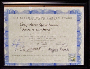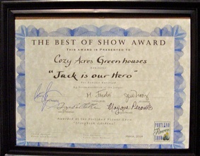 Those who were fortunate to attend the Energy Workshop at Cozy Acres Greenhouses could see the amount of effort and time that Jeff and Marianne dedicate in making Cozy Acres such a successful and well-organized wholesale plant operation. Their commitment to saving energy by embracing solar photovoltaic and geothermal systems is very admirable. Their interest in spreading awareness about energy saving technologies, as evidenced in their spectacular Portland Flower Show exhibit, not only provided some great educational information, but also an uplifting touch of spring during an exceptionally cold winter. The “Jack is Our Hero”