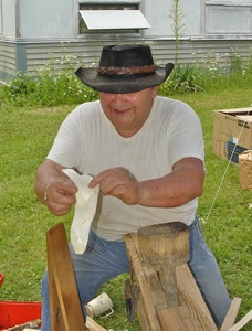 Eldon has built up quite a business harvesting brown ash logs and pounding them into ash splints. He cuts about 250 six-foot ash logs each year. Each day he tries to split one log. Depending on the log and the growth rings, he can usually average twenty-five rolls of splint from a log. He explained that the Natives prefer to work with the white wood splints. He also sells brown ash splints to basketmakers. The months of September through November are the primary months when Eldon likes to harvest the ash trees. He explained that during that time of year the ash trees are losing their leaves and storing water in the tree.