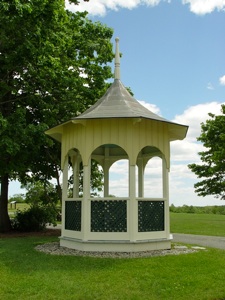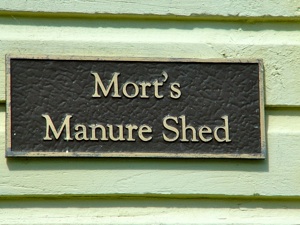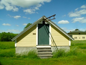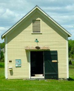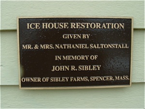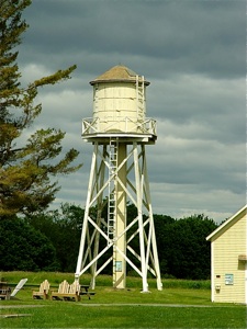 The water tower was built in 1905. It stored water for the livestock. It was fed by a hydraulic ram and electric pumps. Water from the Merriland River (near the bridge on Skinner Mill Road) filled the tank. Water flowed through an intake pipe, pushed by the river current and assisted by electric pumps at each one-way valve. As the central column filled, gravity pulled the water in it down, pushing the valves closed and preventing the water from escaping back towards the river. Water flowed through the holding tank through a system of pipes directly into the animals’ drinking bowls.