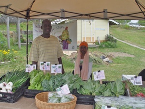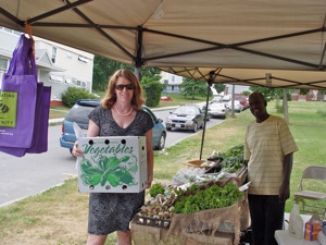Sarah Bostick, Refugee Farmer Specialist, catches up with Mohamed as he prepares for the Farmers’ Market.
