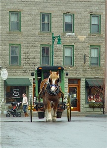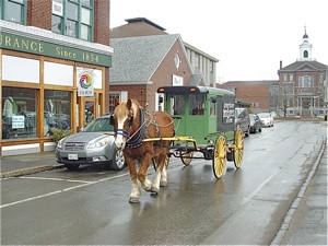 There was a time in our country when the sound of horses trotting down the street with a wagon filled with produce or goods from a farm was a common sight. In some areas where there are Amish or Mennonite settlements, farmers still rely on the horse and buggy to get their goods to market. Thanks to the efforts of Brian Smith, downtown Rockland has Oyster River Farm Express. It is a horse and wagon service that personally conducts a door-to-door drop-off of farm produce. Brian and his Belgian draft horse, Don, deliver locally-made wine, cheese, and bread and locally-raised vegetables, fruit, eggs, and meat.