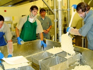 After the production of the cheese is completed, several other steps take place. The ensuing process depends on the specific variety of the cheese. The curd of Swiss and Feta cheese is soaked in tanks of salt water until the correct amount of salt is absorbed. Many cheeses need to age. Cheese that ages for longer periods of time translate into stronger cheese. Some of the sharpest cheddars made by Pineland Farms age for a few years. The mild Monterey Jack cheese can complete its aging process in just two months. When the cheese is ready to be sold, it is brought to the packaging room where it is cut into