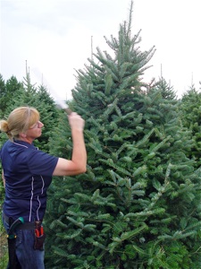 The responsibilities of growing and caring for Christmas trees involves commitments throughout the year. Gaye explained that they attempt to begin the planting of new trees each May. They plant many balsam trees and Fraser fir trees each year. After planting the trees, they spray herbicides to keep the weeds under control. Fertilizing all the trees then follows. The little trees are fertilized by hand. The cones must be picked and removed from all the Fraser fir trees. Gaye explained that if these soft fir cones are not picked, then the energy of the tree will be directed towards the development of the seed. Some trees can have as many as 100 to 300 fir cones! June is the month dedicated to mowing.