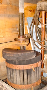 The choice of the sow as part of his business logo is also appropriate because it fits well with the casual and agricultural atmosphere of the winery. There is no question that the antics of farm pigs often provide some lighthearted entertainment. Tom used to raise pigs and goats and chickens. The orchard, the fields, and the weathered buildings and the antique equipment on the property give the feeling of a welcoming old farm. The old rack and cloth press and the rustic oak barrels contribute even further to the down-to-earth old-time quaint atmosphere. The beautiful copper sign of the sow, that was crafted by Rebecca Raye of East Blue Hill, is a great addition to the entrance of the winery.