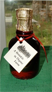 The gathering of the sap at a Wrinkle in Thyme Farm takes place the old-fashioned way with the hauling of the buckets from over four hundred trees that they tap. Unlike so many maple syrup producers, A Wrinkle in Thyme Farm has not opted for the modern system of plastic tap lines running through the woods. Their syrup is available in pints, quarts, and decorative bottles.