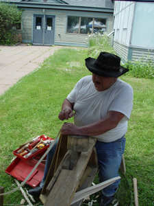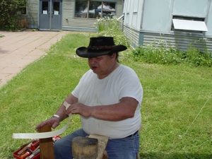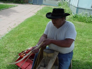 Eldon has built up quite a business harvesting brown ash logs and pounding them into ash splints. He cuts about 250 six-foot ash logs each year. Each day he tries to split one log. Depending on the log and the growth rings, he can usually average twenty-five rolls of splint from a log. He explained that the Natives prefer to work with the white wood splints. He also sells brown ash splints to basketmakers.