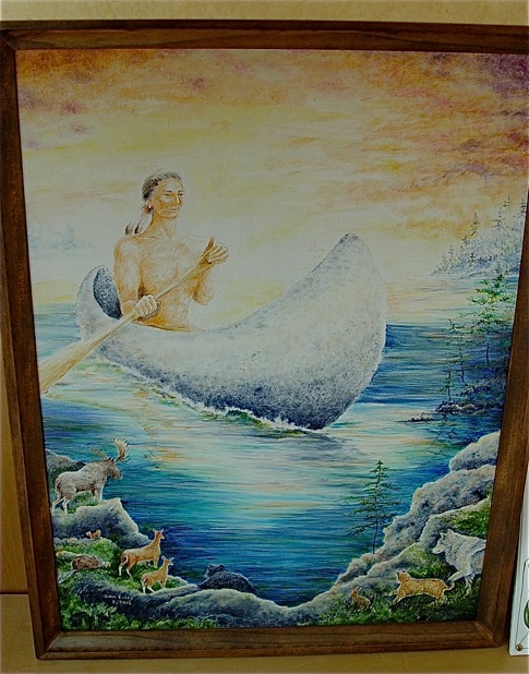 While building a canoe, he began wondering about the history of canoes. This led him to seek more information about Native American culture. He explained that his continued search deepened his respect for the culture and traditions of Native Americans. He studied Native American legends and found them “strangely beautiful, whimsical, interesting,and insightful.” He commented, “As I continued to listen to ancient voices that recounted them, I fell under their charm. Glooscap’s deeds and those with whom he interacted brought images to my mind. These paintings are my attempt to bring some of these to light.”