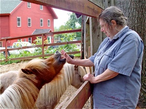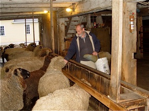 Brother Arnold tends to the sheep in the historic Shaker barn in New Gloucester.