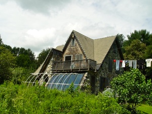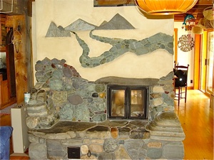 Tom Vigue’s maternal grandfather was an industrial mason. Tom obviously inherited some masonry skills from him. He built their beautiful passive solar house from stone in 1980. The wood for the interior of the house came from the land and the construction took place without the convenience of any electrical access. Their Finnish Contra-Flow Masonry Heater is not only a magnificent work of art and a gathering place with its welcoming built-in bench, but it also serves as a highly-efficient source for heat and baking.