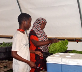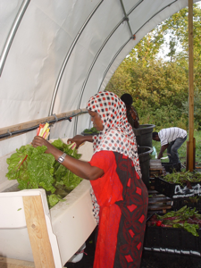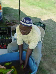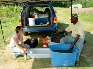 Sarah Bostick, Refugee Farmer Specialist, catches up with Mohamed as he prepares for the Farmers’ Market.