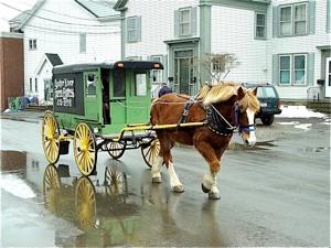 Hats off to Brian and Allie for offering an innovative horse and wagon service in mid-coast Maine. The sight and sound of Brian and Don trotting down the streets of Rockland have provided an insight into a simpler time when people relied on farmers and their horses to provide them with local food. How exciting it is to see a young farmer make the effort and take the time to sell and deliver the produce of several Maine farms and his own Maine-produced wine by horse and wagon. The clickety clack sound of Don on the streets and the smiles that he evokes have become a very innovative way of getting local Maine food to Maine people.
