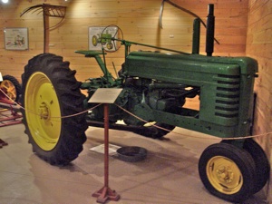 In the Winston E. Pullen Carriage Shop, there is a collection of farm equipment including antique tractors, carts, wagons, and plows. The