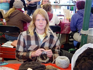 Noah’s raw wool is sold at the Fleece Tent at the Common Ground Fair. He has become skilled in all the steps of working with wool - skirting, washing, carding, spinning, dyeing, skeining, and knitting. His first experience with knitting came about when he was enrolled in a handwork class at the Waldorf School in Blue Hill. He enjoys knitting hats and frequently relaxes by knitting after a day of farm work. He explained that he finds the knitting to be very soothing while he is watching television or sitting by the fire.