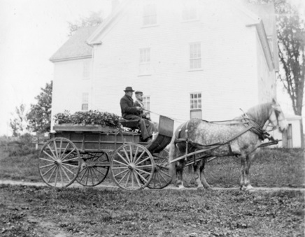 A double load of tomato plants was headed for Norway, Maine, about 1898. Fred Wescott, the driver, is on the left. John Derrington, a farmer buddy is on the right.
