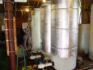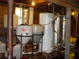 The tank on the left introduces the methanol. The center tank is the overflow for the processor. The electric water tank serves as the processor.