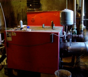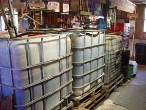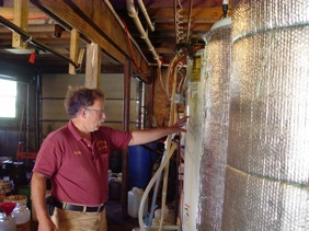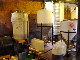 Edgar is shown pointing to the electric water tank. It is used to process the waste vegetable oil and other chemicals into bio-diesel. The two