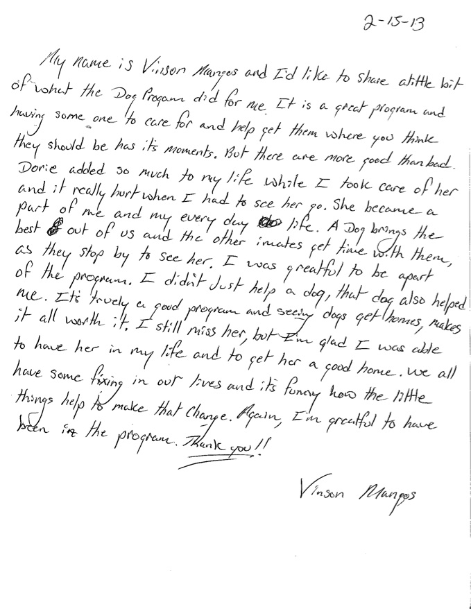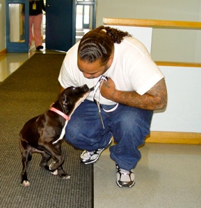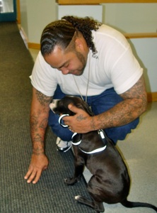 Inmates who agree to participate in the dog training program have to approach their responsibilities very seriously. Each dog is assigned a handler and an assistant handler. Training takes place through positive reinforcements. The dog lives with his handler on a 24/7 basis. The handler or assistant handler