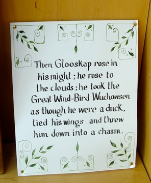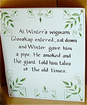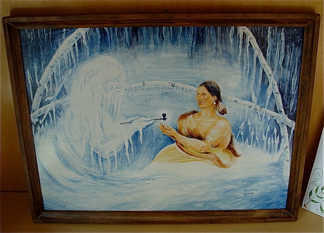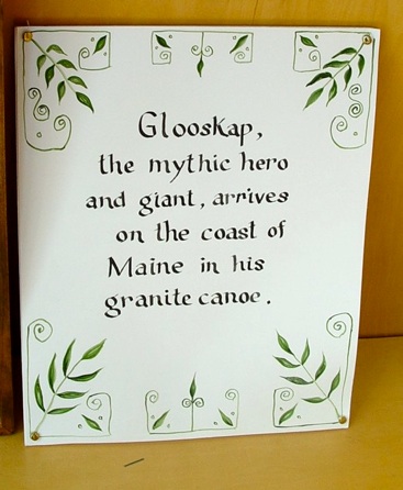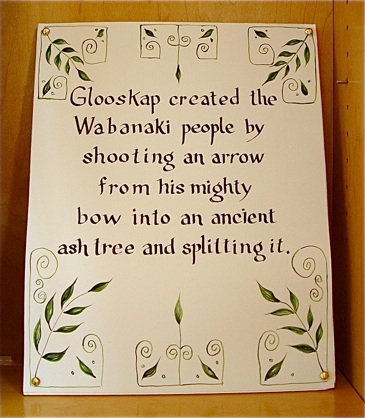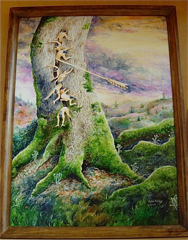 John Foley is a retired French and Spanish teacher from Woodland High School, and an artist who has created a series of paintings on Glooscap that is presently on exhibit at the Wabanaki Culture Center in Calais. He kindly granted permission for photos of his paintings to be shared with the Unique Maine Farms’ project. In the first painting in the exhibit he depicts his interpretation of the creation story in which Glooscap and the ash tree figures predominantly.