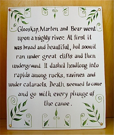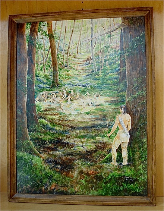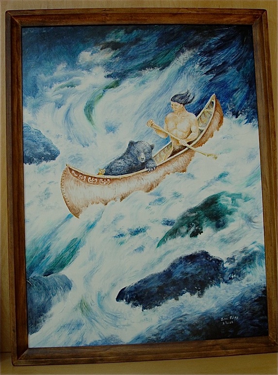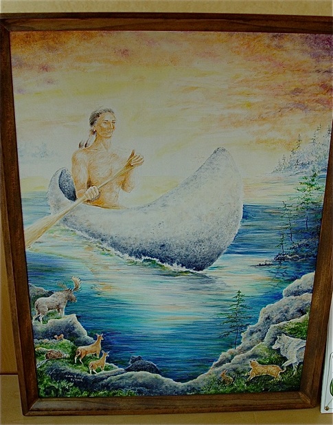 While building a canoe, he began wondering about the history of canoes. This led him to seek more information about Native American culture. He explained that his continued search deepened his respect for the culture and traditions of Native Americans. He studied Native American legends and found them “strangely beautiful, whimsical, interesting,and insightful.” He commented, “As I continued to listen to ancient voices that recounted them, I fell under their charm. Glooscap’s deeds and those with whom he interacted brought images to my mind. These paintings are my attempt to bring some of these to light.”